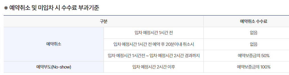 입차 예정시간 2시간 이후 노쇼하는 경우, 예약 보증금의 100%가 위약금으로 발생하며, 예약 취소가 됩니다.