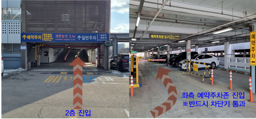 제2주차장 2,3층으로 오시면 예약주차존으로 진입하셔야 하고, 사전 차단기를 반드시 통과하여야 합니다.
