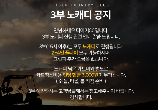 타이거CC는 3부 노캐디 이용시간 뿐만 아니라, 한 달에 한번 노캐디의 날을 이용하실 수 있답니다. 타이거CC 3부 15시 이후에 노캐디가 가능하나, 오전부터 노캐디를 즐기고 싶으신 분들은 타이거CC 노캐디의 날을 활용하시면 좋겠습니다.