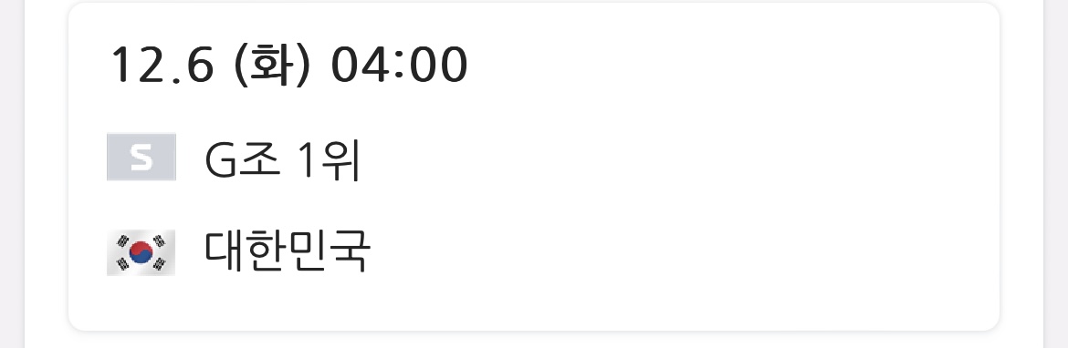 대한민국, 한국의 16강 일정은 G조 1위인 국가와 경기를 진행합니다. 12월 6일 새벽 4시 (한국시간)에 진행되며, 현재 G조의 1위는 브라질로 브라질과 맞붙을 가능성이 매우 큽니다. 2022년 카타르 월드컵 16강 브라질과의 경기에서도 포르투갈 경기에서 처럼 포기하지 않고 최선을 다한다면 좋은 결과 있을 거라 생각합니다.