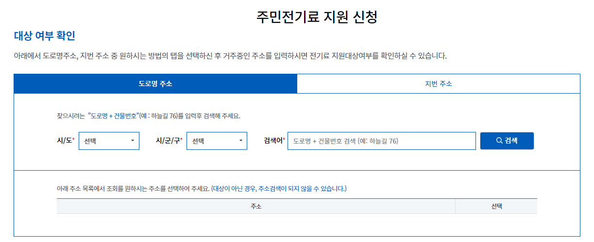 도로명주소, 지번 주소 중 원하는 방법의 탭을 선택하신 후 거주중인 주소를 입력하면 전기료 지원대상여부를 확인할 수 있습니다.