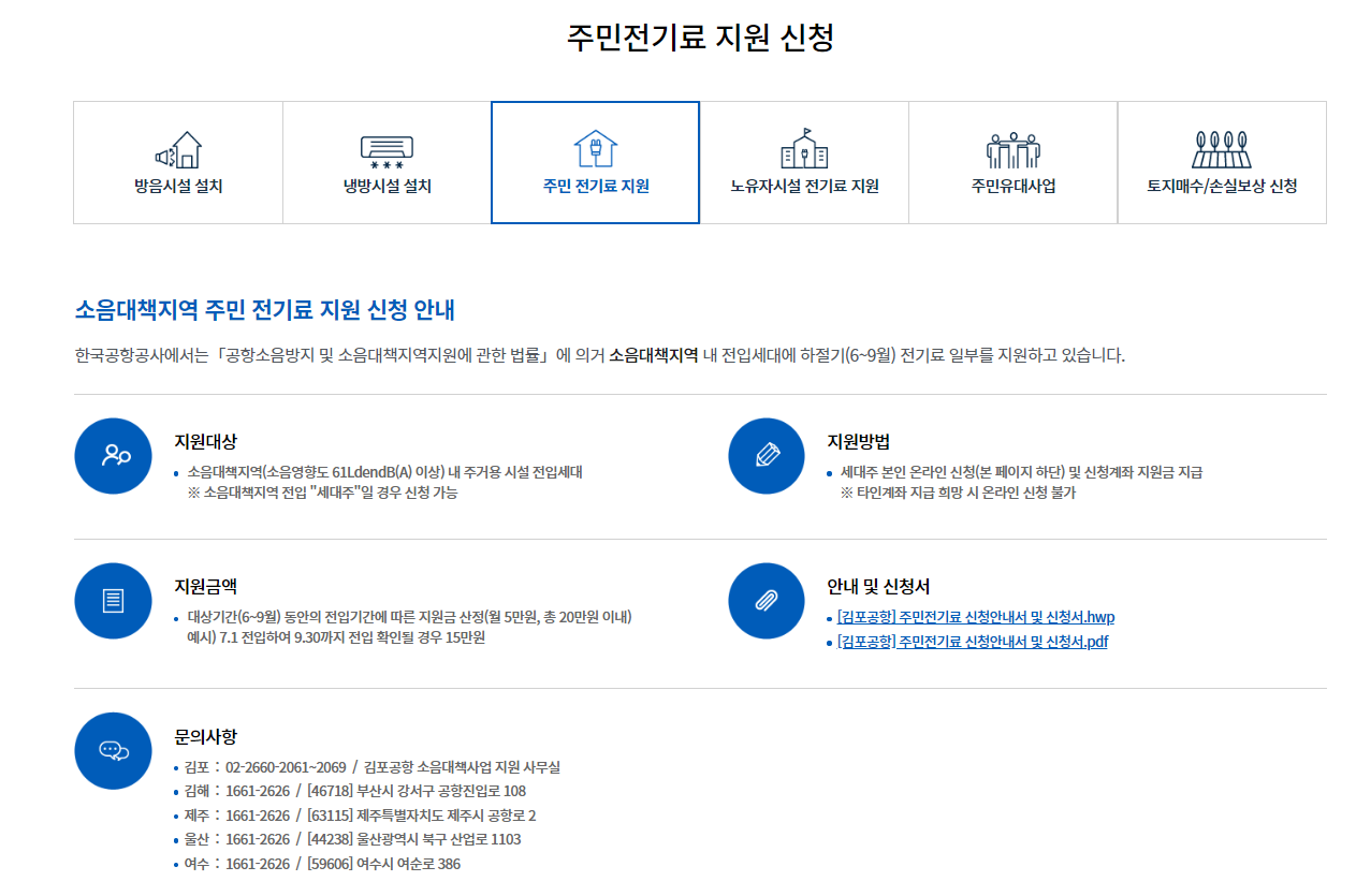 소음대책지역의 주민들은 전기료 지원을 신청해서, 전기료를 지원 받을 수 있습니다. 소음대책지역 내 전입세대에 하절기 (6~9월) 전기료 일부를 지원하고 있는데, 그 이유는 비행기가 지나가는 소음대책지역의 경우에는 창문을 열어놓으면 비행기 소음이 커서 대부분 창문을 닫을 수 밖에 없어 전기료를 지원 해주는 제도입니다.