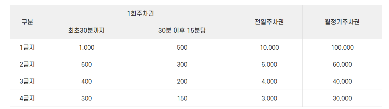 1급지, 2급지, 3급지, 4급지 마다 다르고 1회 주차권, 전일주차권 월정기 주차권 금액 확인하러가기