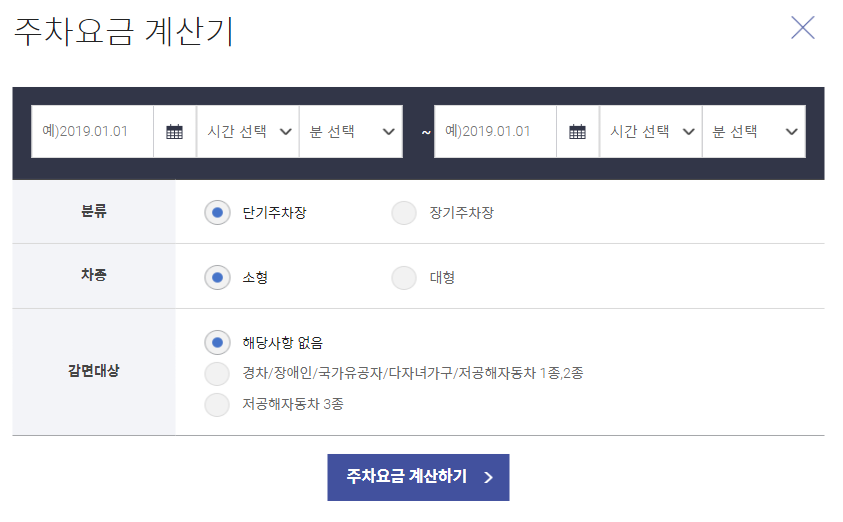 | 단기 | 승용차전용 | 기본 30분 1,200원, 추가 15분 600원 | 24,000원 |