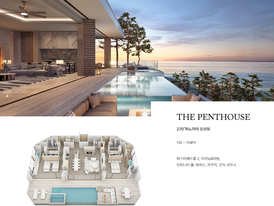 더 펜트하우스 객실 풀크기 가로 9m 세로 2.9m 깊이 1.1m, 객실 내 건식 사우나 시설 보유 예정으로 2025년 준공 예정입니다.