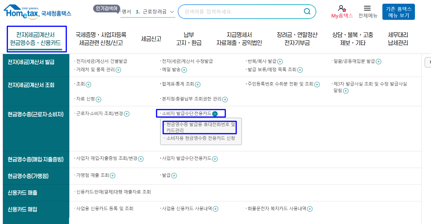 2/ 세부 메뉴에서 현금영수증(근로자, 소비자)를 클릭합니다.