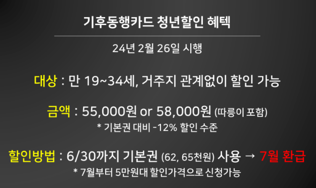 기후동행카드는 62,000원, 65,000원 (따릉이 포함) 해서 두가지 버전으로 사용이 가능합니다. 서울시에서 기후동행카드의 추가 할인을 제공할 예정인데요. 바로 청년의 경우에는 추가 할인이 가능합니다.
