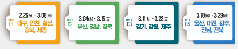 * 1그룹 2.26(월) 09:00 ~ 3.08(금) 18:00 / 대구, 인천, 충남, 충북, 세종