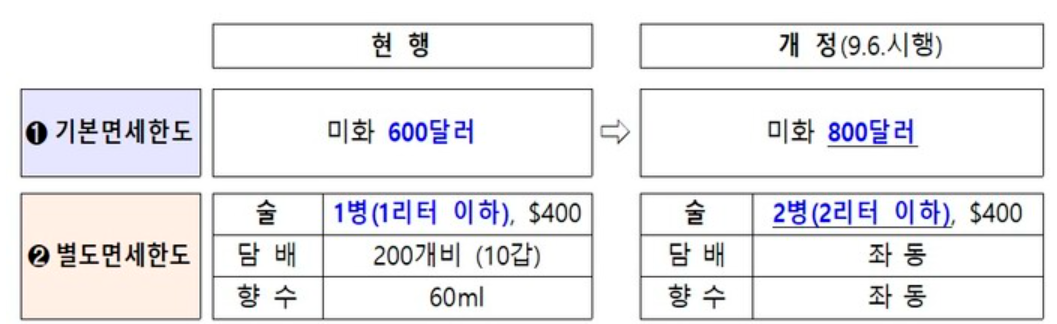 | 기본 면세한도 미화 600달러 → 800 달러 |