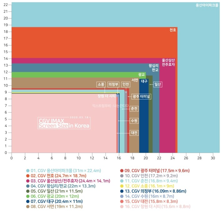 CGV 지점별 스크린 IMAX 크기 비교해보니 역시 용산아이파크몰 (용아맥) 이 1위, 천호, 울산삼산 전주효자,