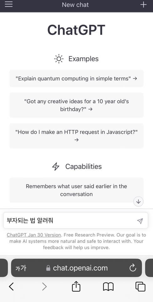 이제 원하는 내용을 검색하면 됩니다. 저는 부자가 되고 싶어서, 예시로 부자되는 법 알려줘 로 검색을 해보았습니다.
