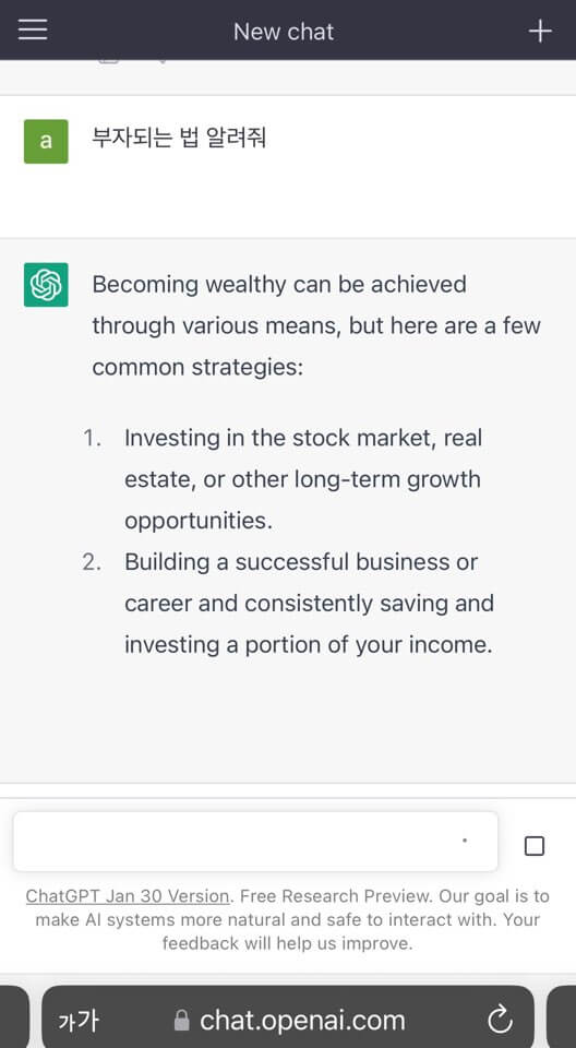 물론 답변은 영어로 알려주었지만, 부자되는 방법을 검색해주는데 5초도 안 걸린 것 같습니다.