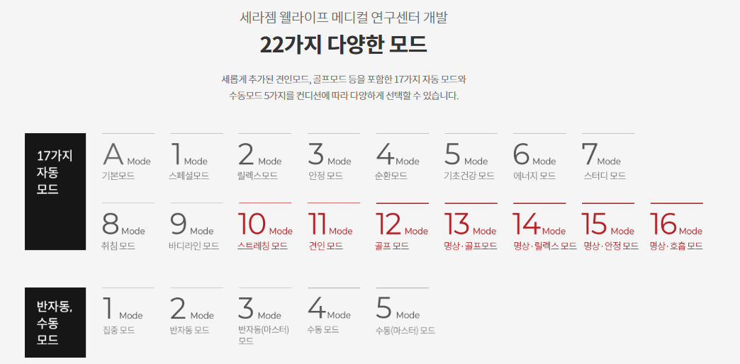 오늘은 세라젬 마스터 V6 모드 설명 기능을 알아봤는데요. 마스터 V6 총 22가지 모드가 있어서,