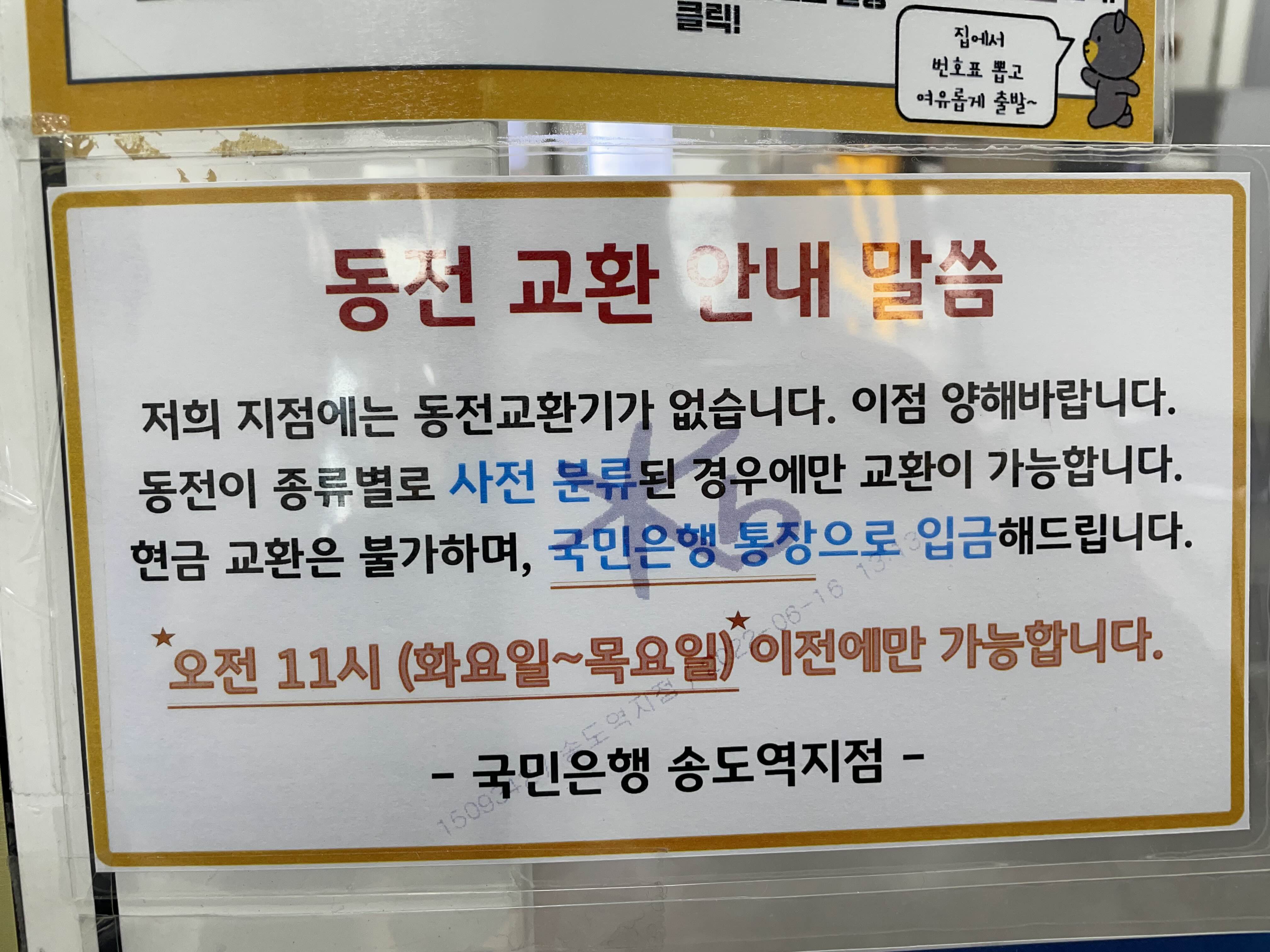 예전과 달리 요즘은 국민은행 지점마다 동전교환 가능한 요일과 시간이 정해져 있더라구요.